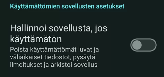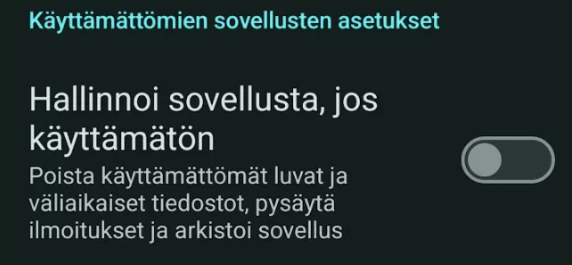 Uudemmat Android-versiot voivat poistaa sovelluksen käyttöoikeuksia automaattisesti, jos sovellusta ei ole käytetty pitkään aikaan. Tällöin käyttäjän tulee tarkistaa ja tarvittaessa myöntää käyttöoikeudet uudelleen, jotta sovellus toimii oikein. Suosittelemme kytkeään DriveNoterin ja Cabidin kanssa tämän automaatisen toiminnon pois mikäli käyttöjärjestelmän versio sen sallii. “Käyttämättömien sovellusten asetukset” joka löytyy jokaisen “Sovellusluvat” näkymän alareunasta.